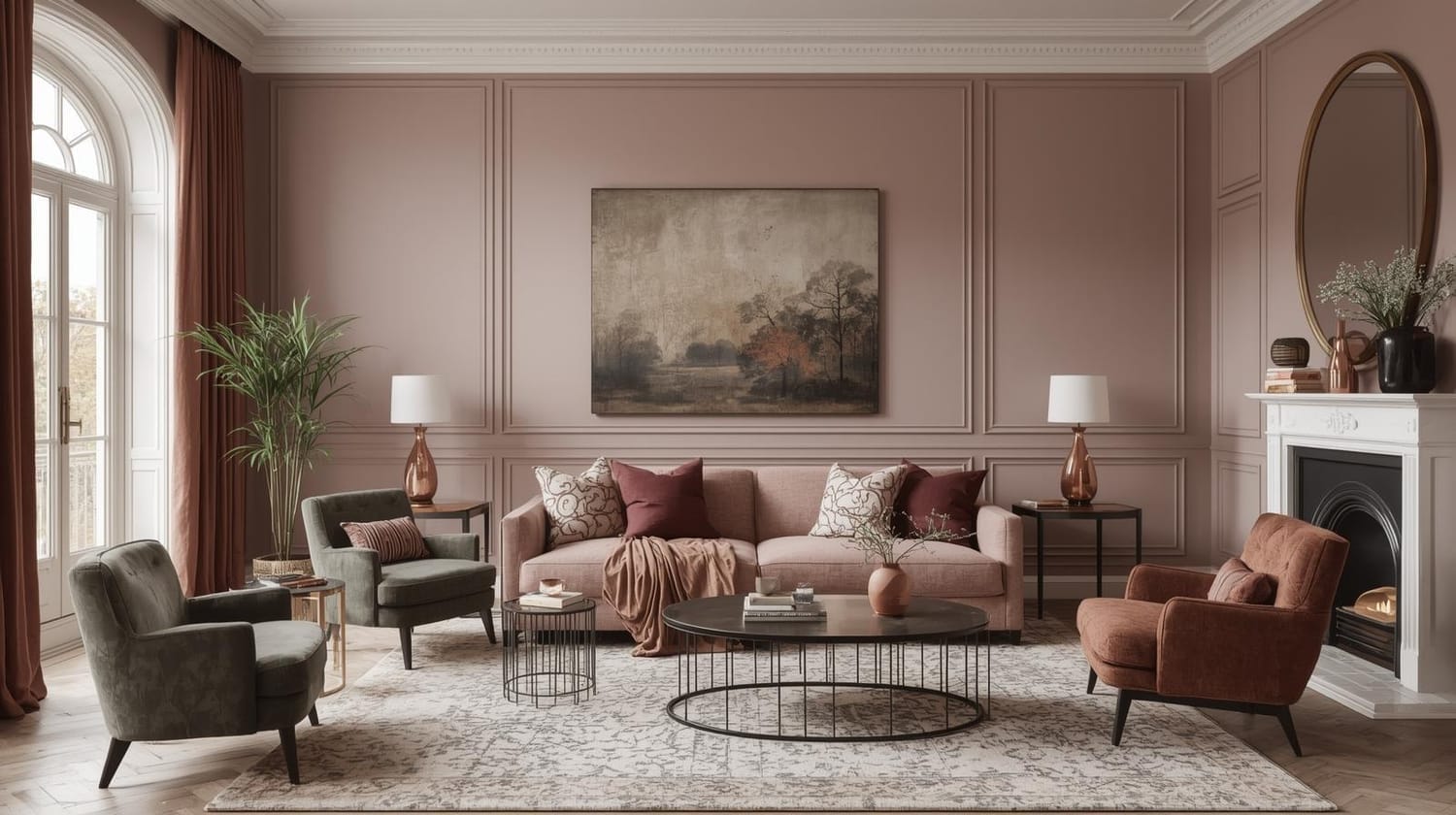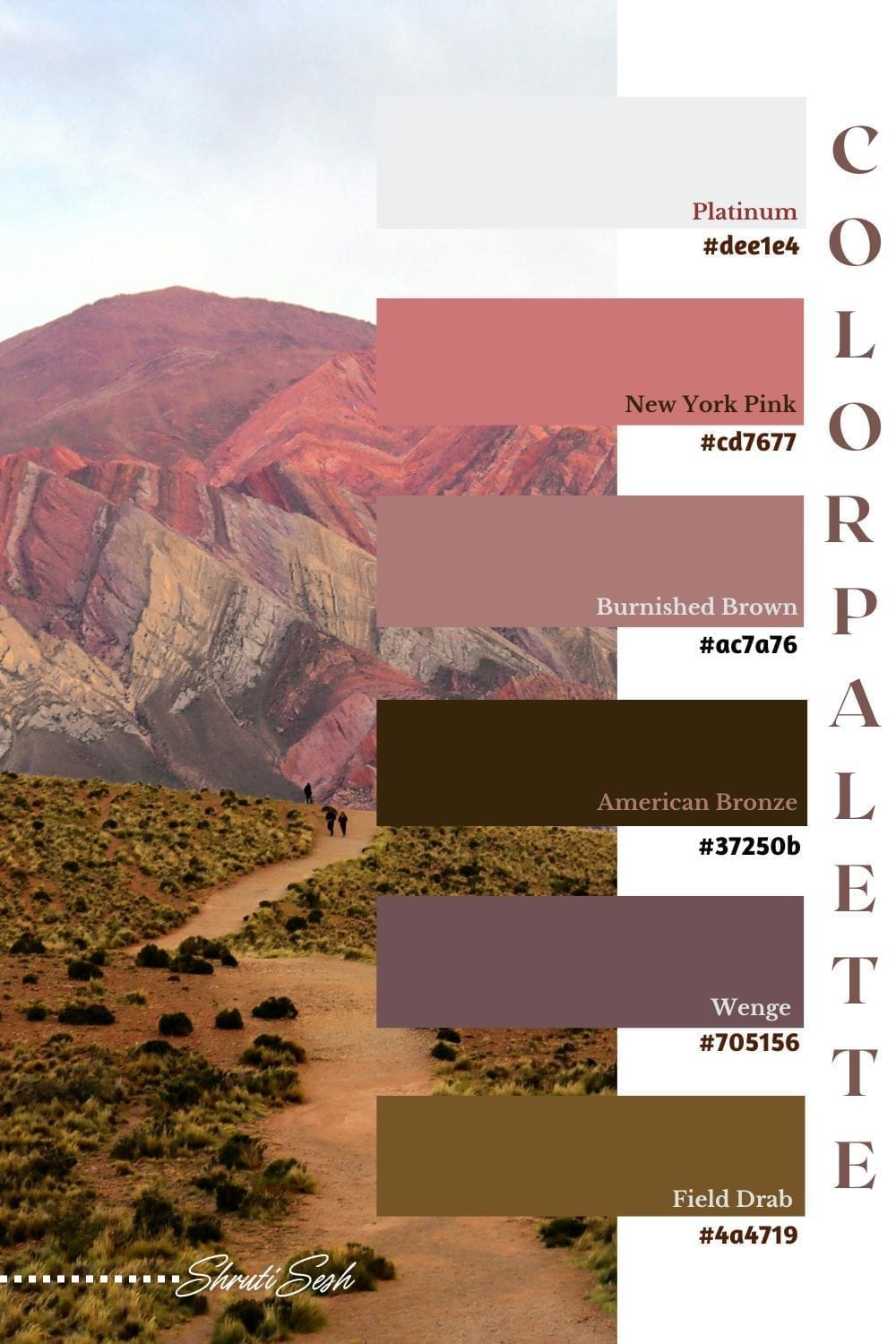 #705156 (Wenge): A deep, muted pink-brown. It is a more sophisticated and less vibrant version of pink, adding a sense of softness and romance without being overly sweet. It works well as an accent color for pillows and other small decor. Alternative name Dusky Rose.