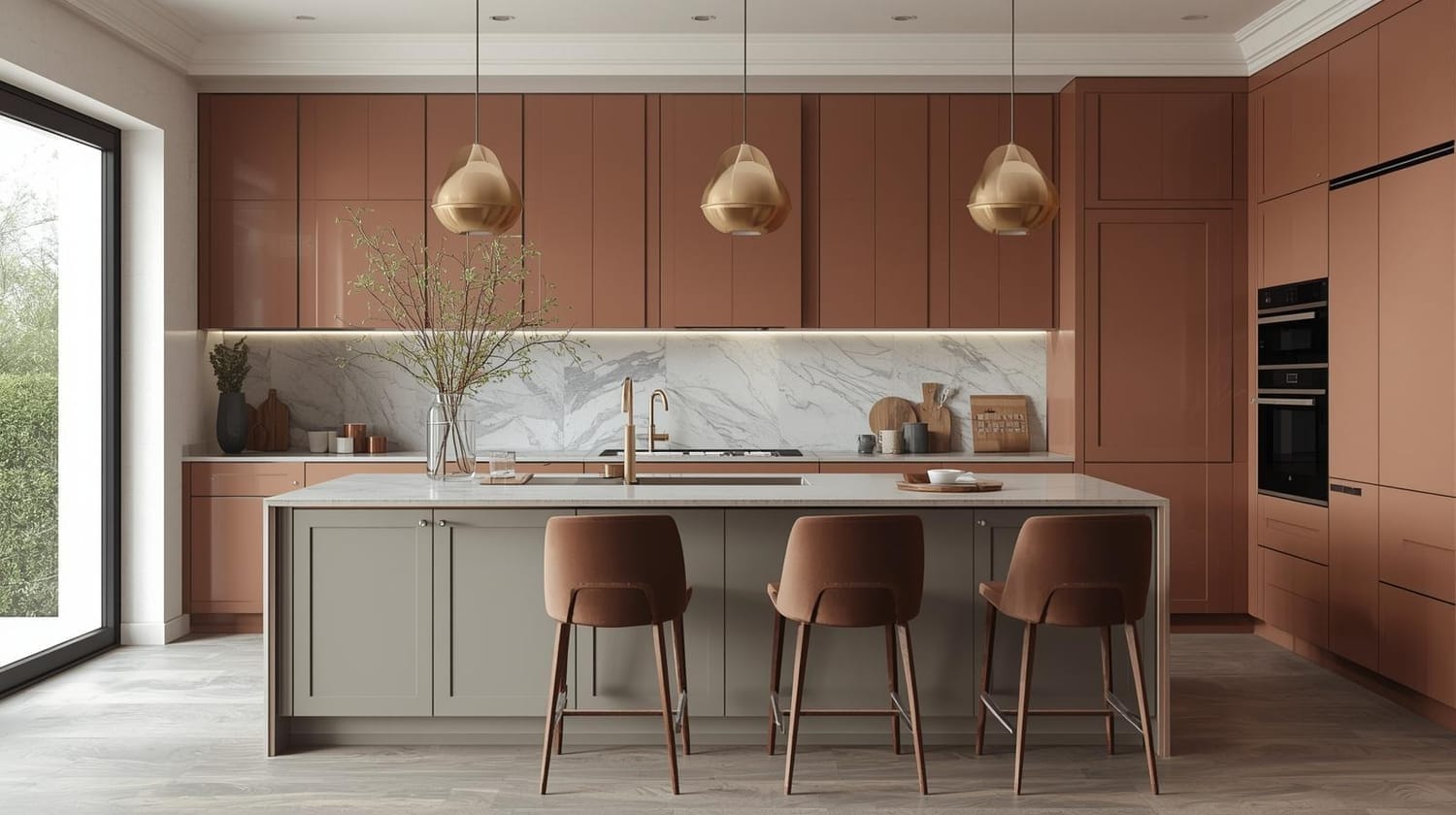This kitchen design embraces a chic, earthy aesthetic, utilizing the same calming color palette.