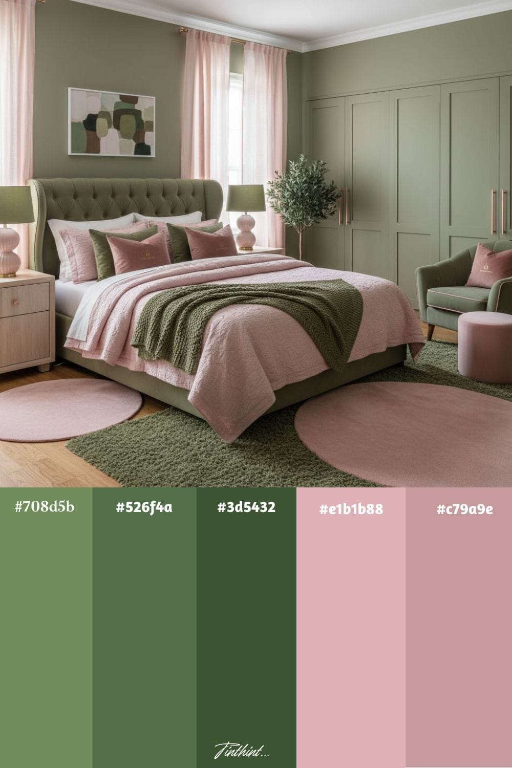 Olive green and blush pink make a dreamy pairing for bedrooms, striking the perfect balance between earthy and romantic. Olive green adds a grounded, calming backdrop—think accent walls, bedding, or curtains—while blush pink softens the space with warmth and elegance through throw pillows, rugs, or artwork. Together, they create a cozy yet refreshing atmosphere that feels both modern and inviting.