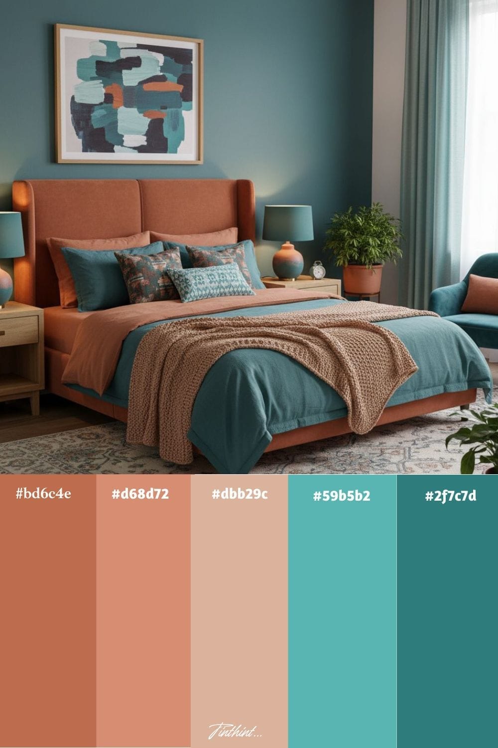 Terracotta and teal make a striking yet balanced choice for a bedroom, blending warmth with vibrancy. The earthy tones of terracotta create a grounded, cozy backdrop through walls, throws, or bedding, while teal adds a refreshing pop of color with cushions, lamps, or artwork. Together, they evoke a bohemian yet elegant vibe, turning the bedroom into a lively sanctuary that feels both inviting and full of personality.