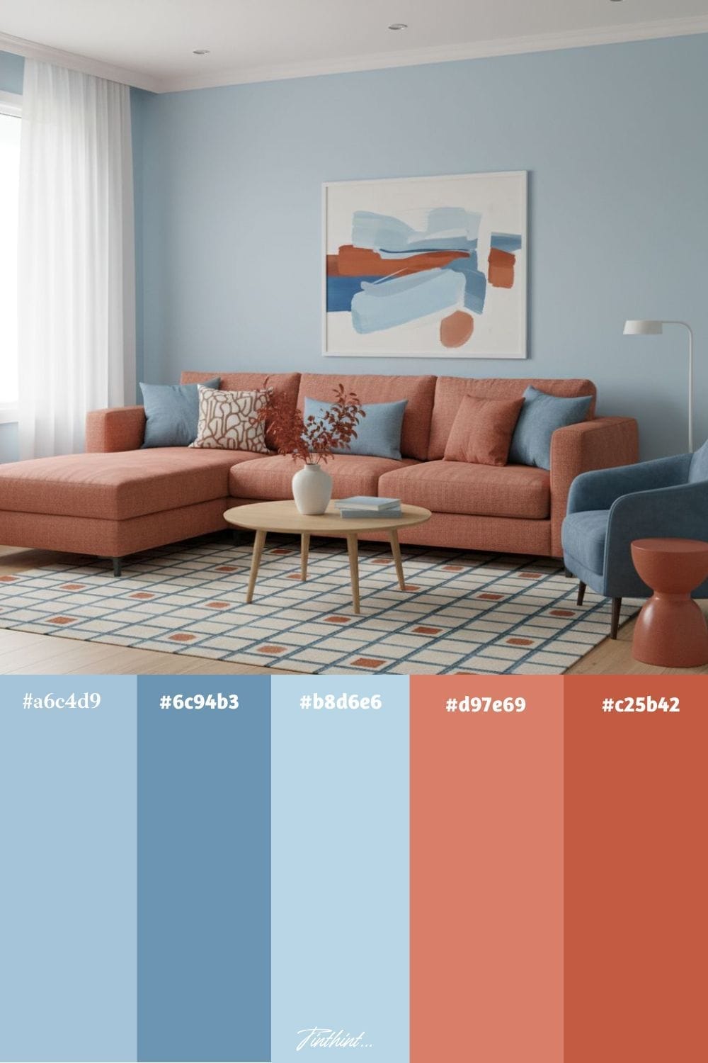 Sky blue and terracotta red make a refreshing choice for a living room, blending cool calmness with warm energy. Sky blue creates a light, airy feel on walls, chairs, or curtains, while terracotta red adds a cozy, earthy touch through throws, rugs, or accent furniture. Together, they evoke a Mediterranean charm.