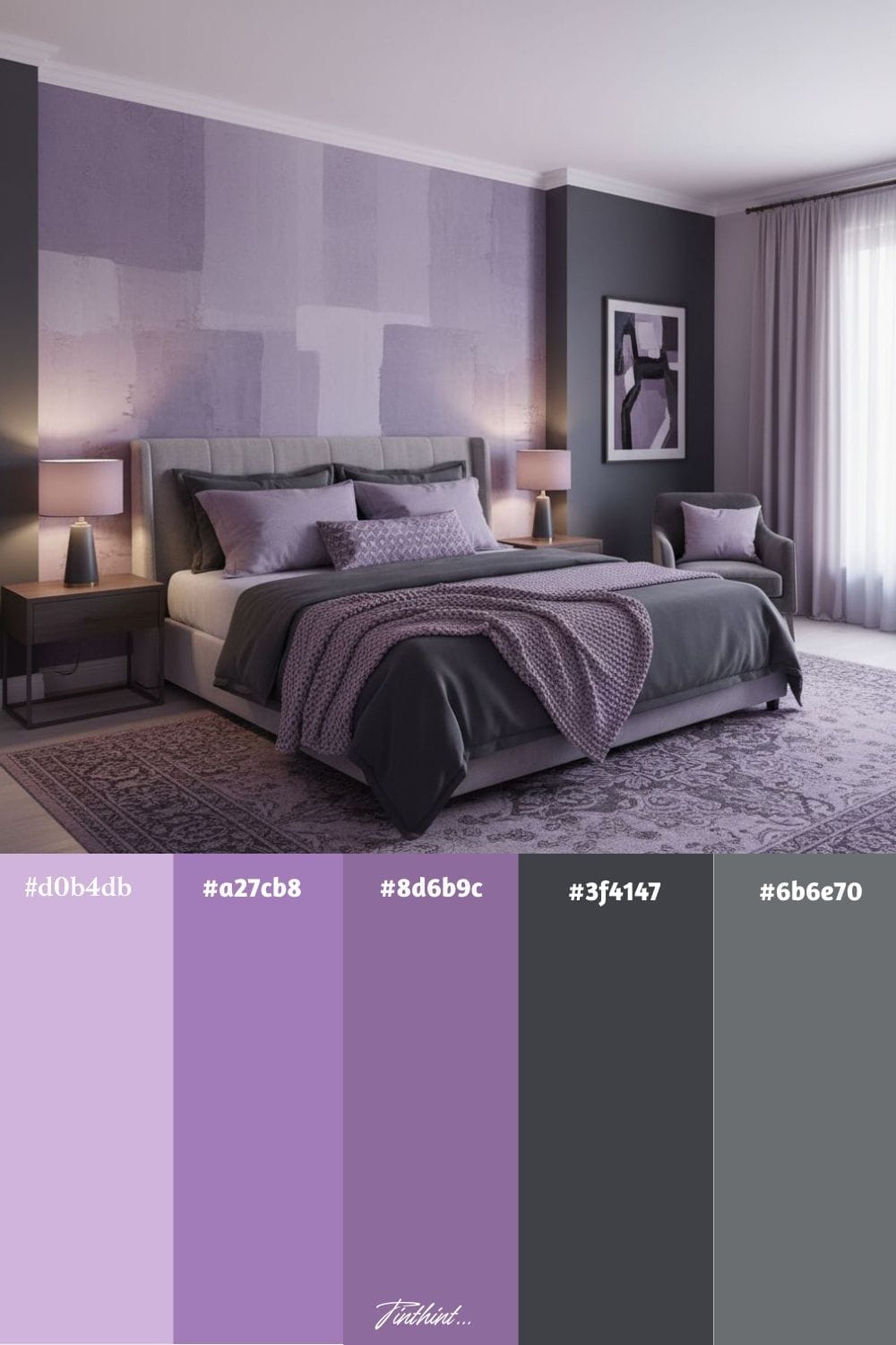 Lavender and charcoal gray make a sophisticated pairing for a bedroom. The soft, calming tone of lavender sets a relaxing atmosphere, perfect for walls, bedding, or curtains, while charcoal gray grounds the palette with depth and modern elegance through furniture, rugs, or accent decor. Together, they strike a balance between light and dark, creating a restful space that feels cozy and stylish.