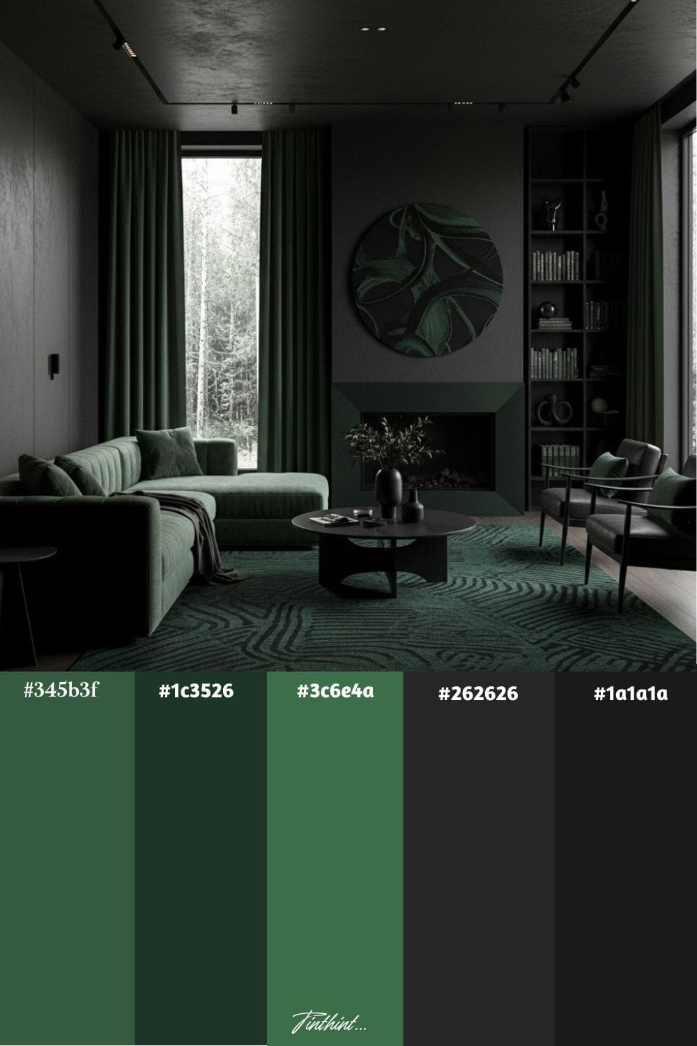 Black and forest green create a bold, moody atmosphere in a living room that feels both luxurious and grounded. Black adds sleek sophistication through furniture, frames, or lighting fixtures, while forest green brings depth and richness with wall paint, upholstery, or statement decor. Together, they form a dramatic yet elegant palette that makes a strong statement—perfect for those who want their space to feel powerful and unforgettable.