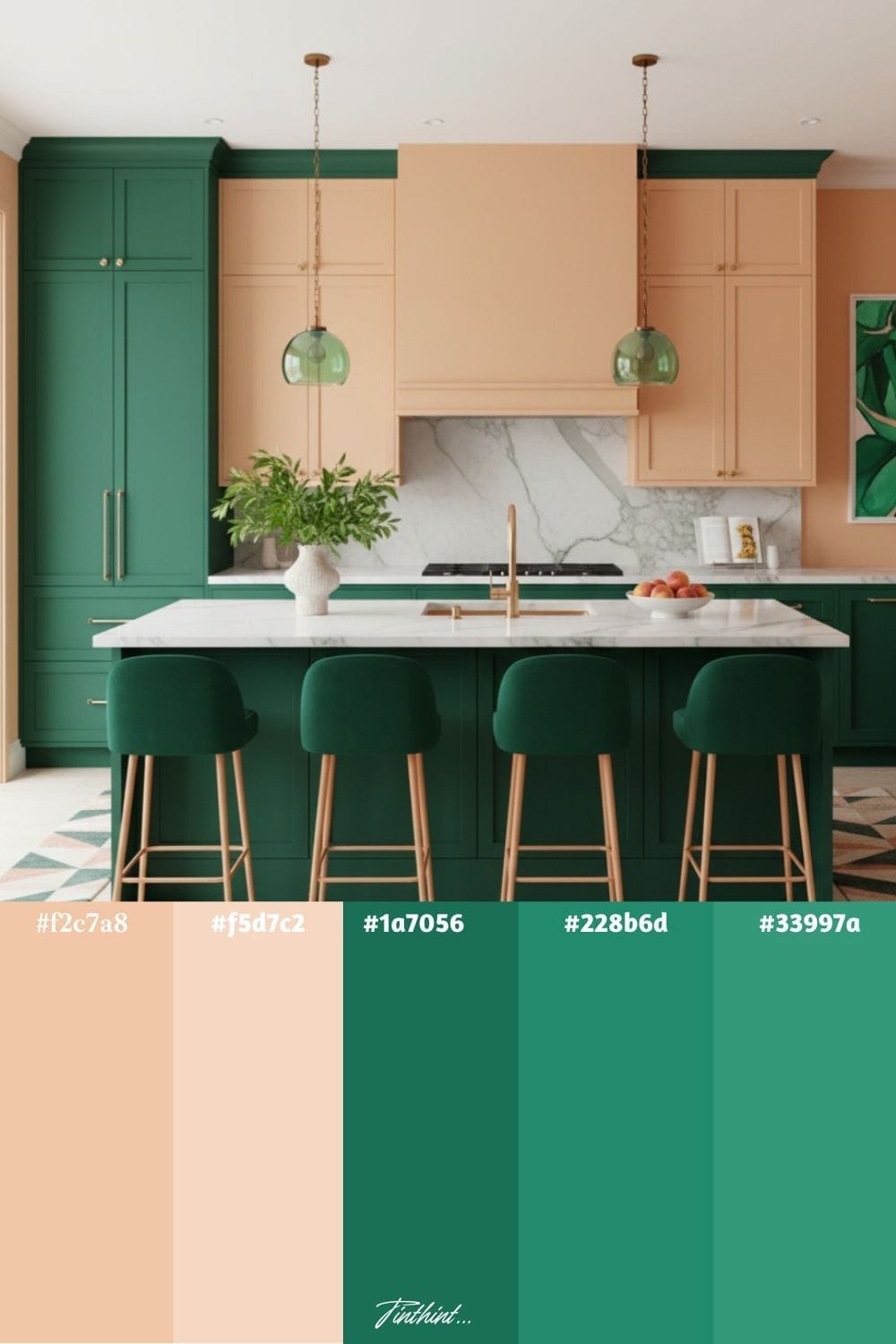 Peach and emerald green bring a refreshing mix of warmth and vibrancy to a kitchen, creating a space that feels lively yet inviting. Peach introduces softness and brightness through walls, cabinets, or backsplash tiles, while emerald green adds richness and depth in accents like bar stools, kitchenware, or feature walls. Together, this pairing shows a playful charm, making the kitchen not just functional but also a stylish focal point of the home.