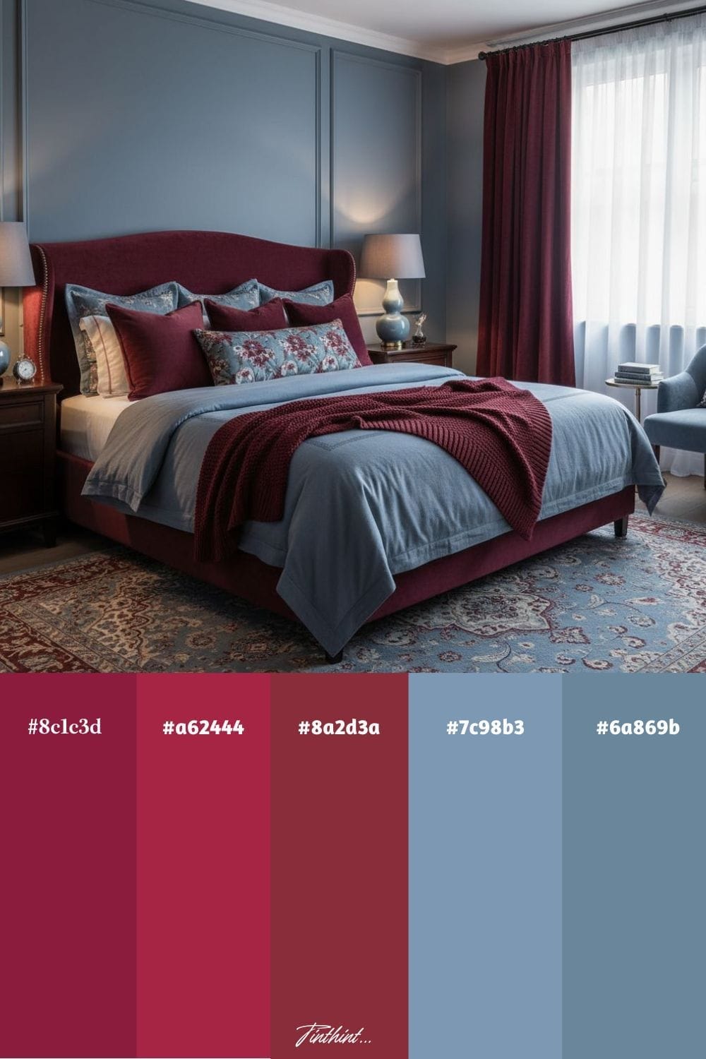 Burgundy brings depth and warmth through bedding, curtains, or accent walls, while dusty blue softens the look with a soothing, airy touch in pillows, rugs, or artwork.