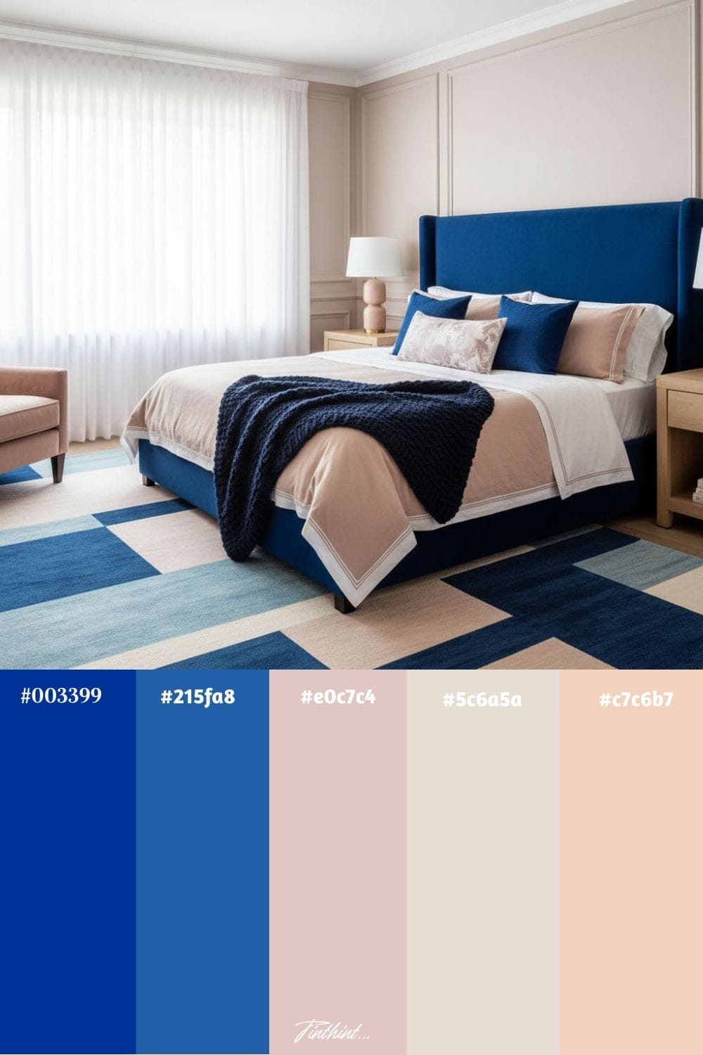 Cobalt blue and blush beige create a striking yet soothing palette for a bedroom, blending boldness with softness. Cobalt blue adds depth and drama through walls, bedding, or accent furniture, while blush beige balances it with warmth and subtle elegance in rugs, curtains, or décor pieces.