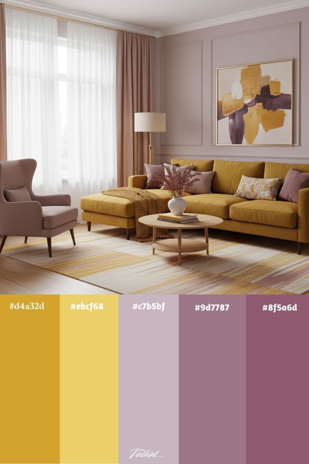 Mustard and mauve create a retro-inspired vibe in a living room, combining warmth with subtle elegance. Mustard brings a burst of energy through armchairs, cushions, or rugs, while mauve softens the palette with its muted, romantic undertone on walls, curtains, or decorative accents.