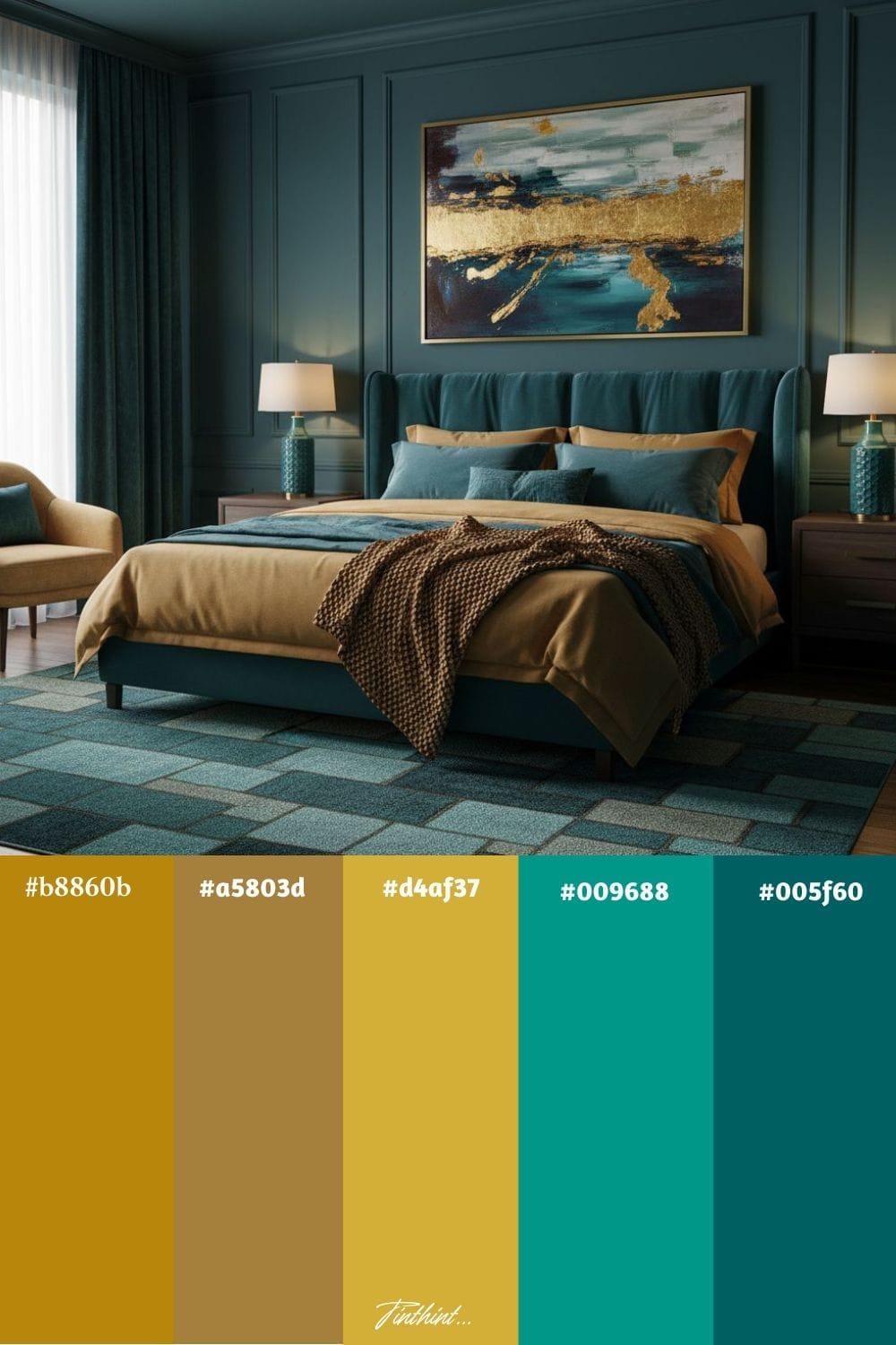 Mustard Gold adds a cozy, inviting glow, while Deep Teal brings depth and a sense of calm. Together, they create a bold yet restful ambiance ideal for a modern bedroom.