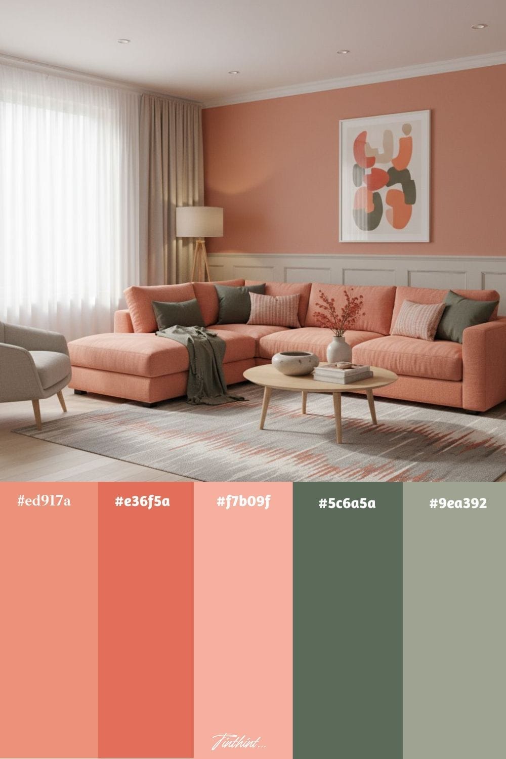 Coral adds a lively, cheerful touch through accent chairs, cushions, or wall art, while olive gray provides a calm, neutral base in sofas, rugs, or curtains. Together, they create a modern yet inviting atmosphere that feels fresh and approachable, perfect for a space where family and friends gather.
